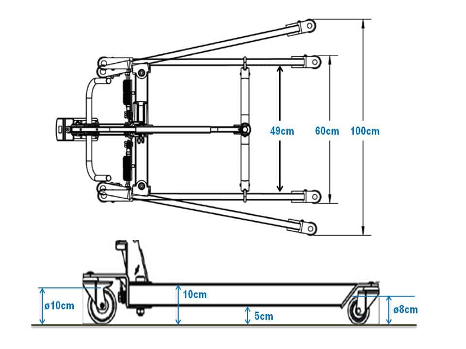 - Fleksibel anvendelse: Fodpedal til spredning af ben, 360° drejelig løftearm og store hjul med bremser